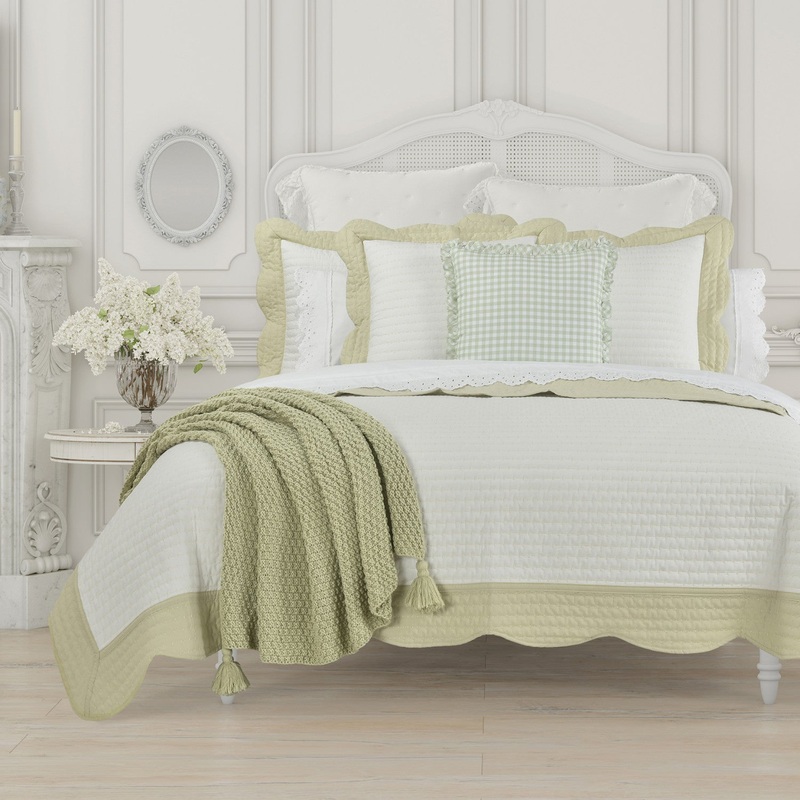 Frame your bed with the relaxed scalloped border of the Amherst. Featuring a timeless Farmhouse style white cotton center, with a 5 scallop trim on all four sides, with rounded corners for a beautiful drape look. Soft pre-washed cotton on both sides gives this lightweight layer an irresistibly smooth hand feel. Available in multiple color options to match your decor, a colored thread is used for the intricate channel quilt stitching, and the reverse fabric matches the border for a touch of color. Pair this Quilt with the Amherst Pillow shams, and it is easy to mix-and-match with Euro shams and throw pillows from the Piper & Wright collections to create your own unique look.