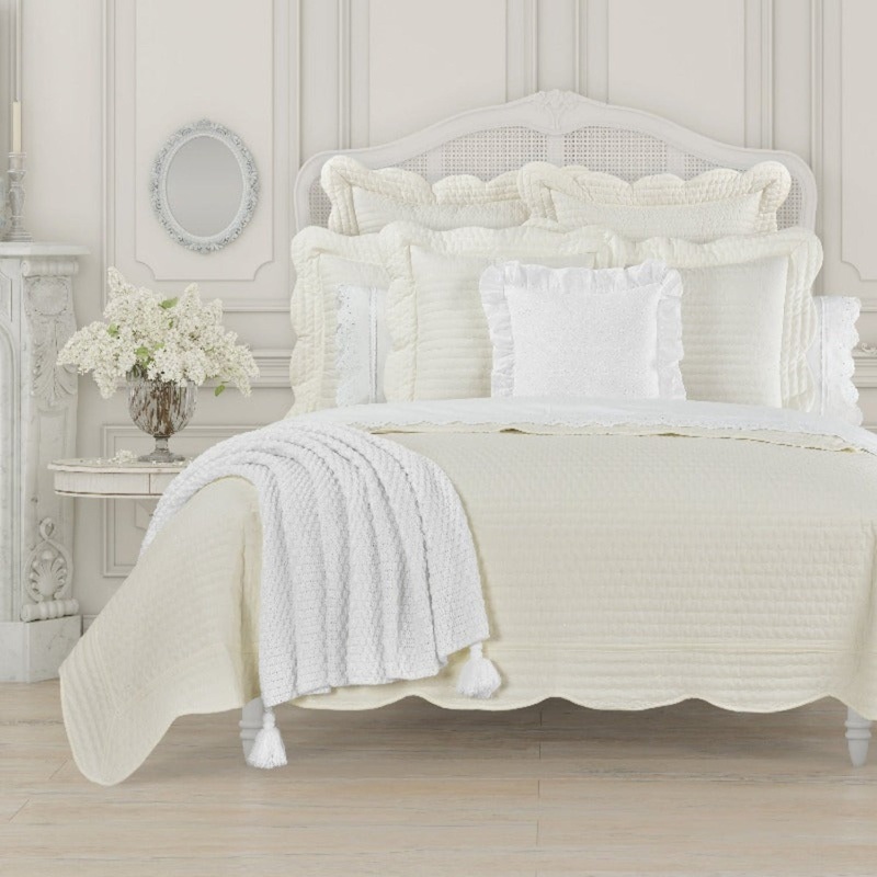 Frame your bed with the relaxed scalloped border of the Amherst. Featuring a timeless Farmhouse style with a 5 scallop trim on all four sides, with rounded corners for a beautiful drape look. Soft pre-washed cotton on both sides gives this lightweight layer an irresistibly smooth hand feel. Available in multiple color options to match your decor, a colored thread is used for the intricate channel quilt stitching, and the reverse fabric matches the border for a touch of color. Pair this Quilt with the Amherst Pillow shams, and it is easy to mix-and-match with Euro shams and throw pillows from the Piper & Wright collections to create your own unique look.