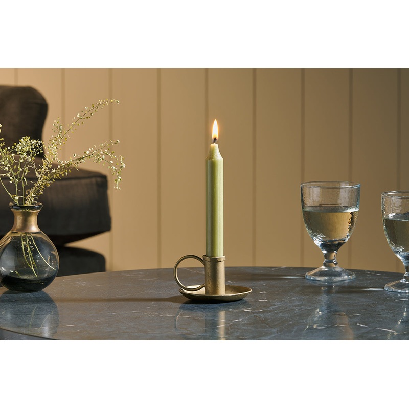 Candlelight creates a magical ambience and this individual Amiri iron candlestick brings a sense of nostalgia for a bygone age. The elegant design has a charming handle and dish and the antique brass tones add a warmth that will glow under a flickering flame.