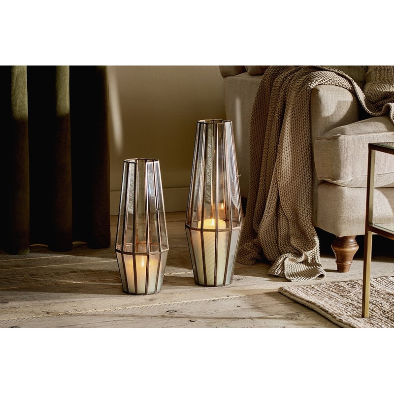 Tall and elegant, the distinctive shape of our Arar lantern will ensure it makes a stylish statement. The antique bronze finish is the perfect counterpart to the warm glow of candlelight. The upper section of the lantern is open-sided while the base is crafted from frosted glass, which softly diffuses candlelight and creates a beautiful ambience. The metal has been skillfully soldered around the glass using traditional tools, creating a striking and sophisticated product. Available in two sizes.