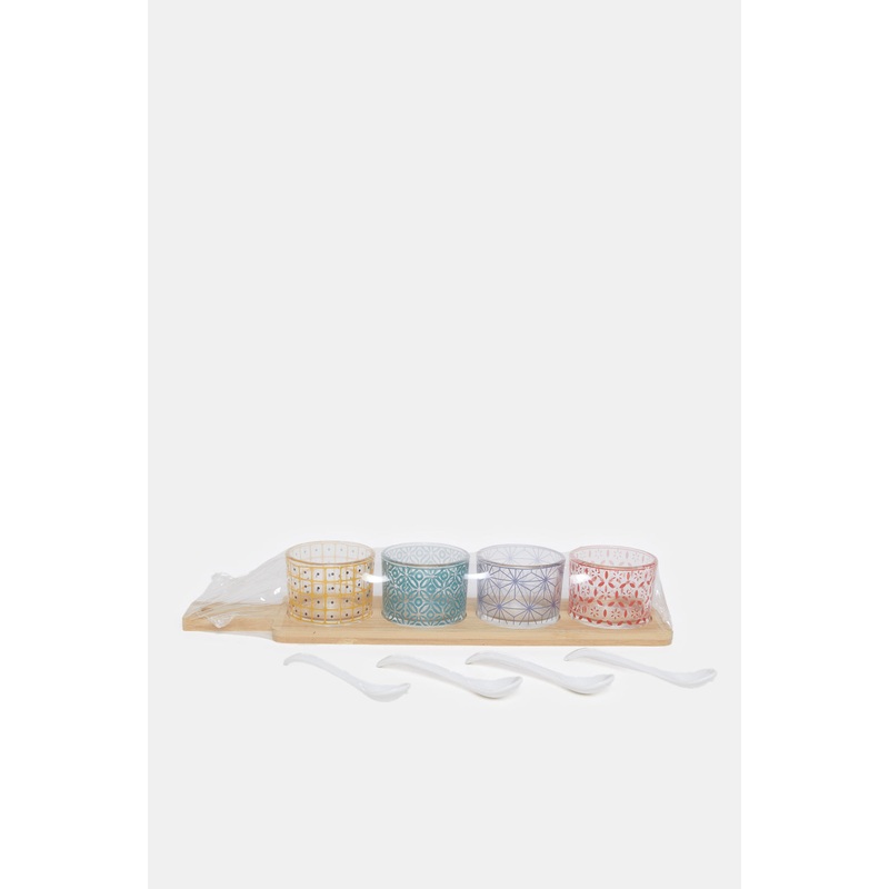 This elegant serving set features four bowls, each adorned with a unique and colourful geometric pattern, paired with matching white spoons. The bowls rest on a sleek bamboo tray, making it perfect for serving a variety of dips, sauces, or appetizers. Stylish and functional, this set is ideal for entertaining guests or adding a decorative touch to your dining table.