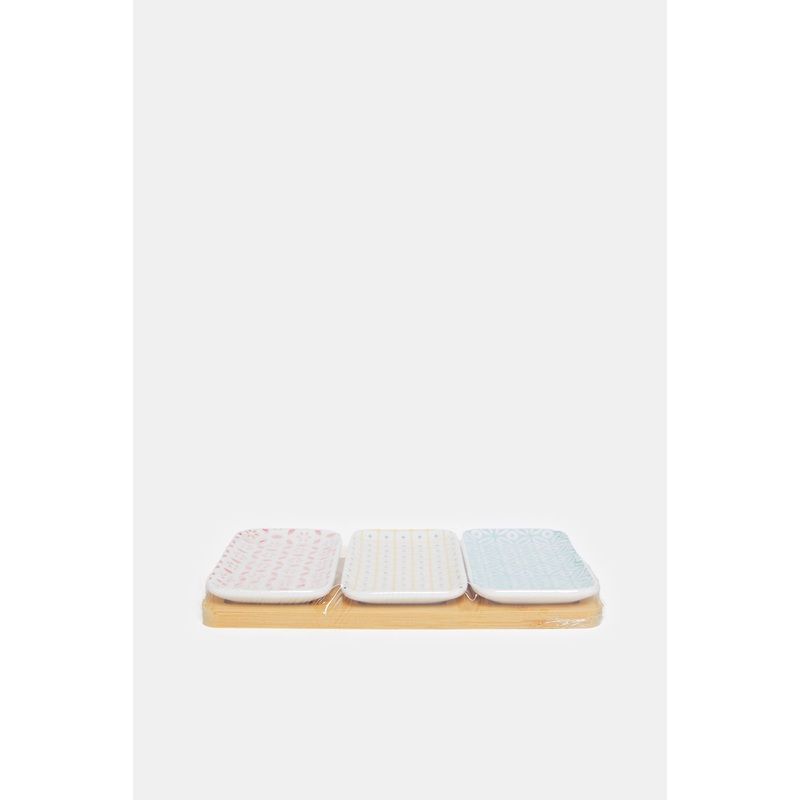 This stylish serving set includes 3 bowls with vibrant geometric patterns, perfectly complemented by a bamboo tray. Ideal for serving dips, snacks, or small dishes, it adds a touch of colour and elegance to any table setting. The set is both practical and