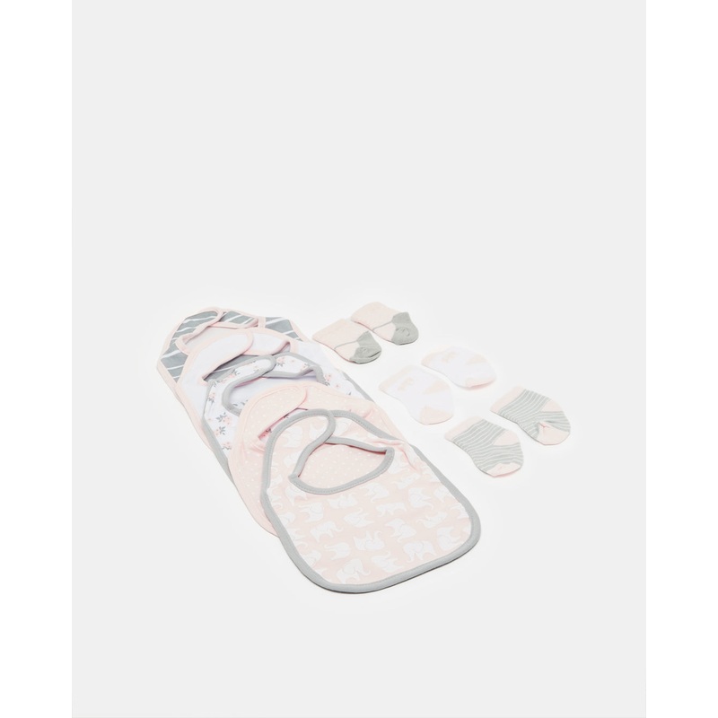 A practical set of 5 bibs and 3 pairs of socks for newborns, made from soft and absorbent fabric for everyday use.Gender: Newborn AccessoriesColour: AssortedPattern: PrintSize: 19x30.5cmMaterial: InterlockStyle No: 131111923