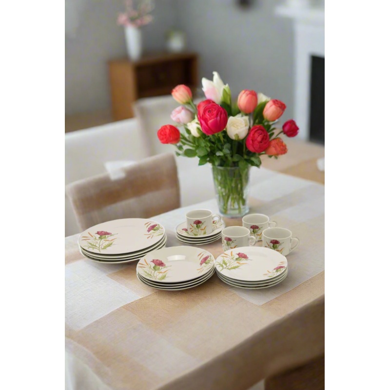 Brighten up your dining table with this stunning 20-piece floral print dinner set. Featuring delicate, vibrant patterns, this set adds a touch of elegance and charm to any meal. Perfect for both everyday dining and special occasions, it brings a fresh, sty
