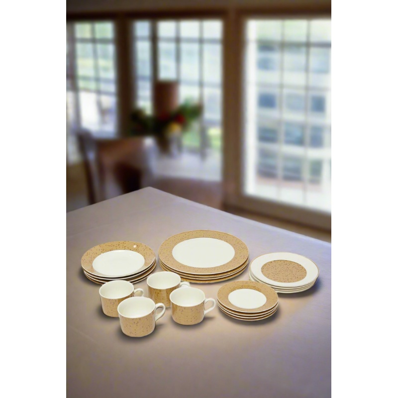 Add luxury to your table and serve food in the most appetizing way with this white porcelain dinner set. This set consists of 4 dinner plates, 4 soup plates, 4 dessert plates, 4 tea cups and 4 saucers.Section: Home-DiningColour: BeigePattern: PrintSet Incl