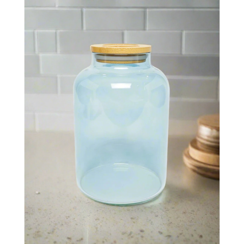 A durable and stylish storage jar, perfect for keeping food fresh and organized. Ideal for kitchen or pantry use.Section: Home-DiningColour: BluePattern: PlainSize/Dimensions: Capacity 1950mlMaterial: Glass, WoodStyle No: 131425244