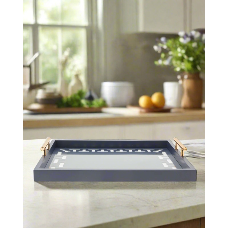 A versatile and stylish tray, perfect for serving drinks, snacks, or displaying decorative items. Designed for convenience with a sleek and elegant touch, making it an essential piece for any home.Section: Home-DiningColour: BluePattern: EmbellishedSize/Di