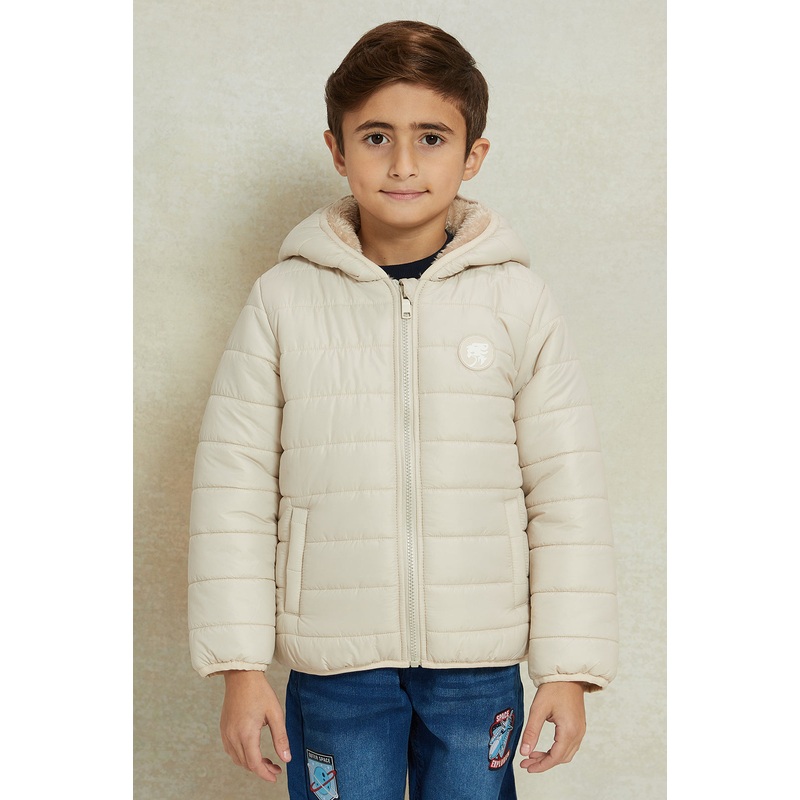 Boys Beige Puffer Jacket With Sherpa Lining