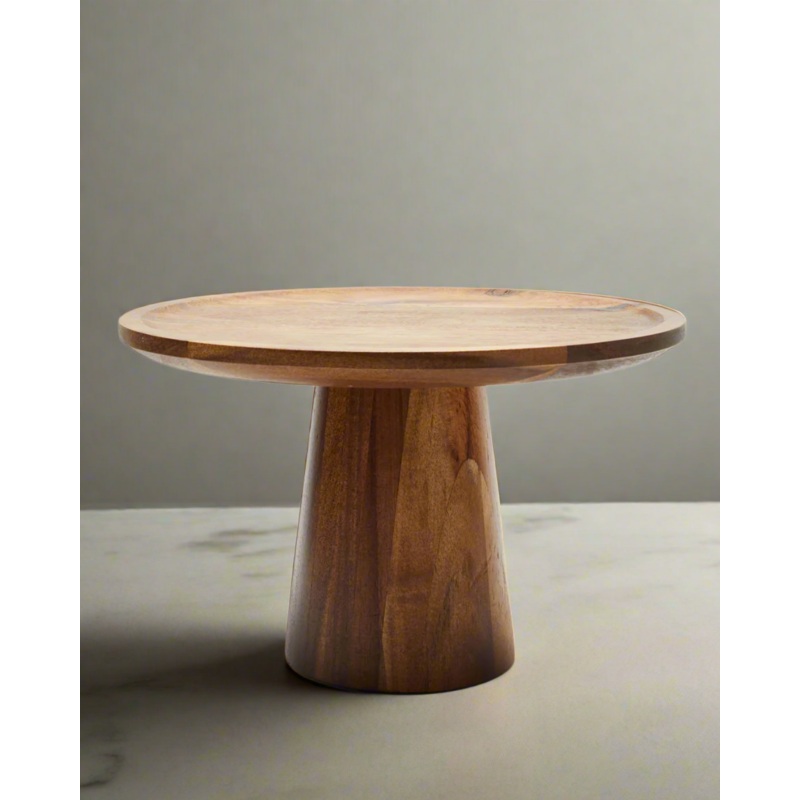 A beautifully crafted wooden cake stand, perfect for displaying and serving cakes with a touch of rustic charm.