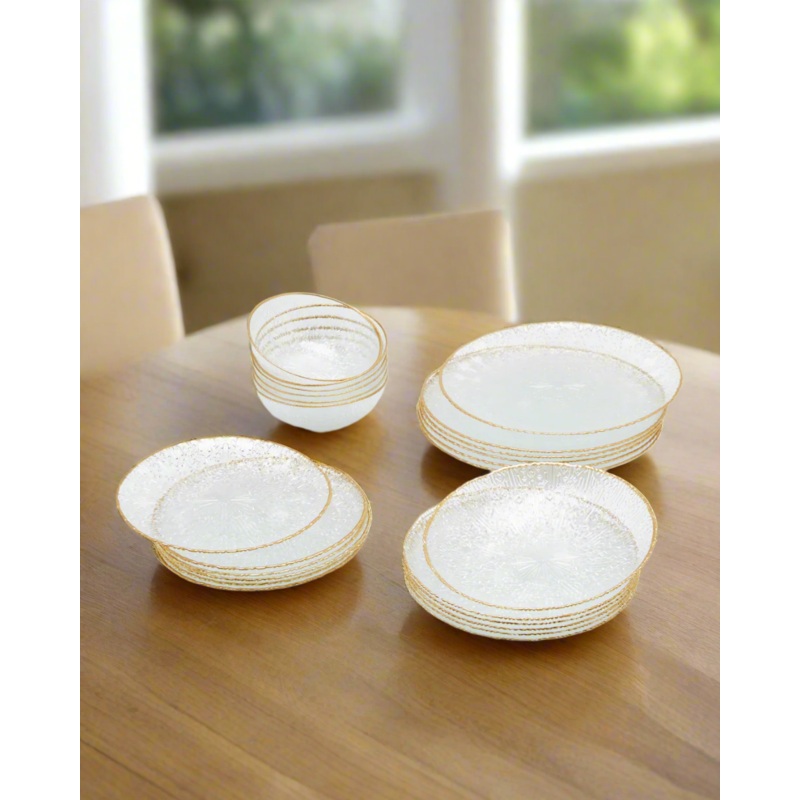 Enjoy every dish with our carefully designed dinner set, perfect for enhancing the warmth of your dining experience.Section: Home-DiningColour: ClearPattern: EmbossedSize/Dimensions: 6 x Dinner Plate 6 x Dessert Plate 6 x Soup Plate 6 x Soup BowlMaterial: