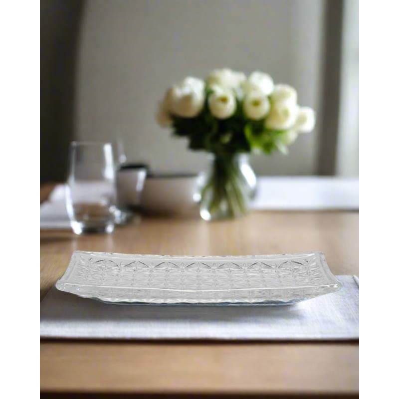 A stylish glass plate that adds a refined touch to your table setting.Ideal for serving desserts, appetisers, or main courses.Section: Home-DiningColour: ClearPattern: GeometricSize/Dimensions: Height 2.5cm x Length 28cm x Width 14cmMaterial: GlassStyle No