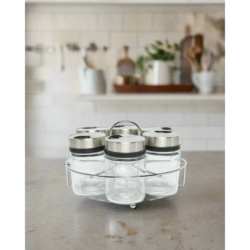 A stylish set of glass spice jars with a sturdy metal stand. Ideal for keeping your kitchen organized and your ingredients fresh.Section: Home-DiningColour: ClearPattern: PlainSet Includes: 6x Jars 1x MetalSize/Dimensions: Capacity 120mlMaterial: Glass, Me