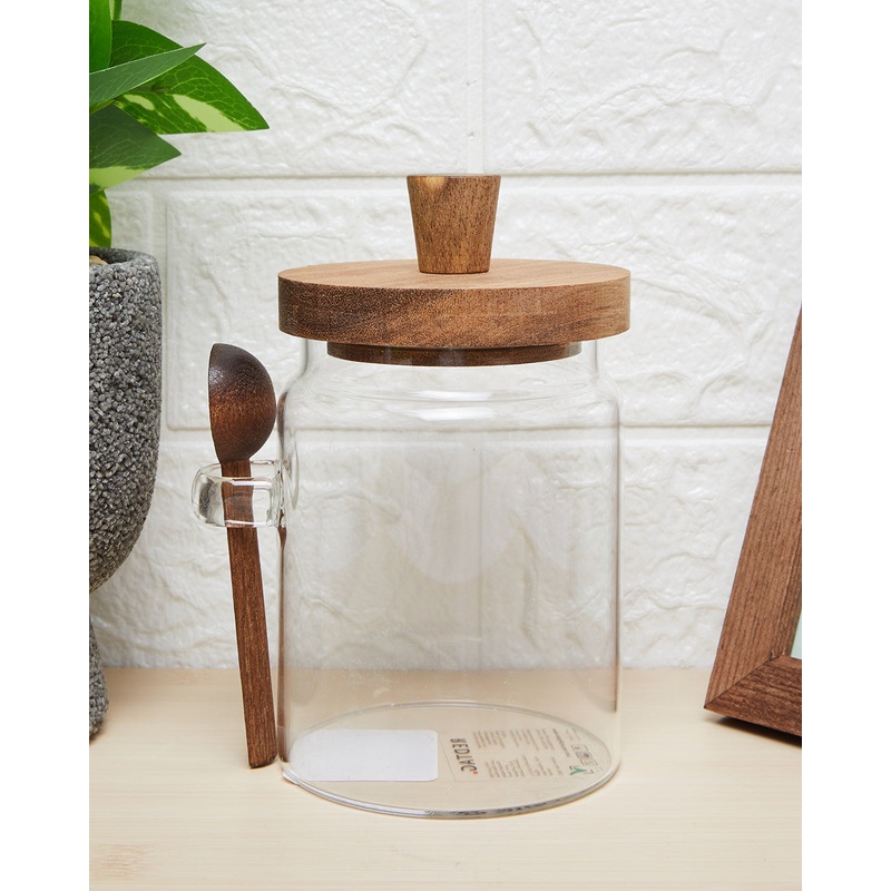 Clear Glass Storage Jar With Wooden Lid And Spoon (Medium)