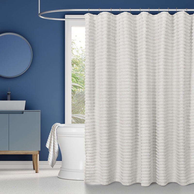 Revitalize your bathroom decor with the Darby Shower Curtain, designed to make a striking statement. This shower curtain features a plush tufted stripe pattern paired with a tonal burst of color. Available in an array of color options, making it ideal for