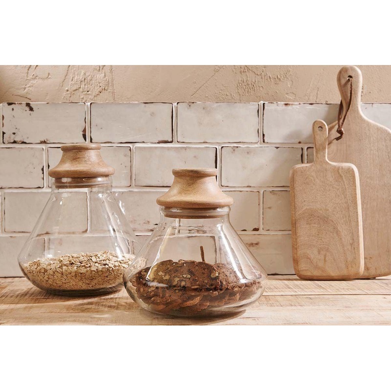 We are elevating kitchen storage to a new high with these handblown glass jars. Their refreshed shape and hand-turned natural mango wood tops combine for a truly elegant finish. Ideal for storing dried food such as pulses and pasta. The mango wood tops are