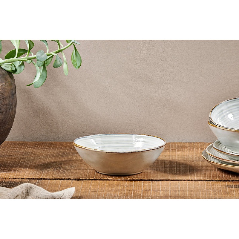 The rustic natural tones of the Dhanuk cereal bowl have an attractive understated charm. The Dhanku cereal bowl is finished with a reactive glaze which ensures each pieces has its own unique appeal. The soft cream tones sit elegantly on a tablescape. The b