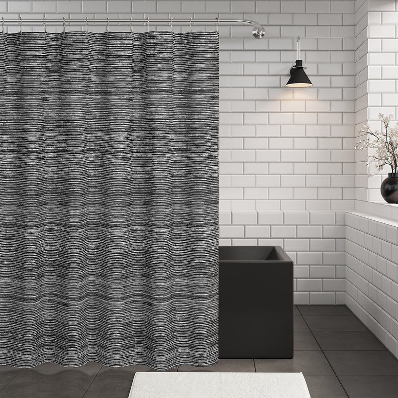 Enhance the look of your bathroom decor with the contemporary style of the Flen Shower Curtain. The textured black & white stripe design adds a unique appearance and the durable microfiber fabric has a plush hand-feel. This standard size 72″x72″ shower curtain is machine washable, making it easy to clean and long lasting. Shower liner is recommended.