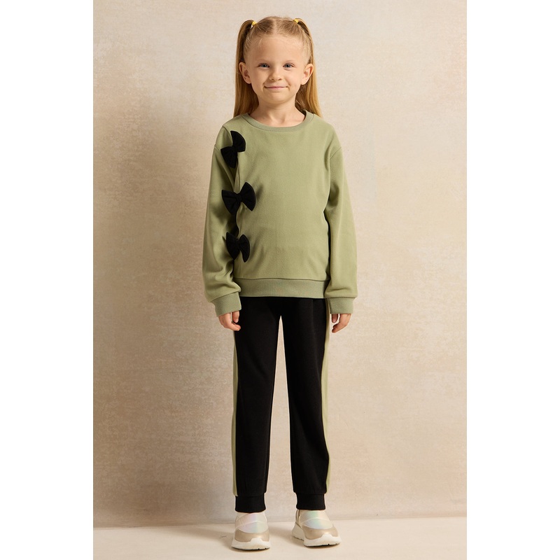 The sweatshirt showcases an adorablebow detailon the front, adding a playful touch to the classic design. Its relaxed fit allows for easy movement, making it perfect for both indoor and outdoor activities. The black track pants are designed with an elastic