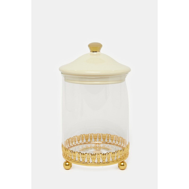Add a touch of luxury to your storage with this gold glass jar featuring a chic ceramic lid. Perfect for keeping essentials organized while enhancing your space with elegance.Section: Home-DiningColour: GoldPattern: PlainSize/Dimensions: 1200mlMaterial: Bo
