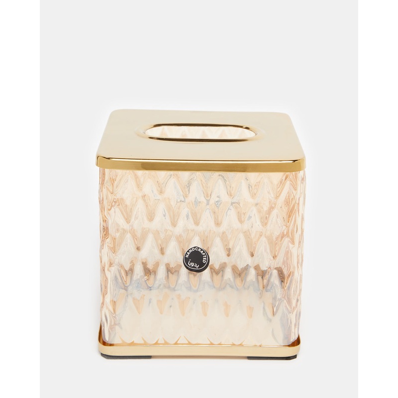 A luxurious glass tissue box with elegant gold edges, adding a refined touch to any space while keeping tissues neatly stored.Section: Home-DecorColour: GoldPattern: GlassSize/Dimensions: Height 14Cm X Width 14Cm X Depth 14CmMaterial: GlassStyle No: 131818