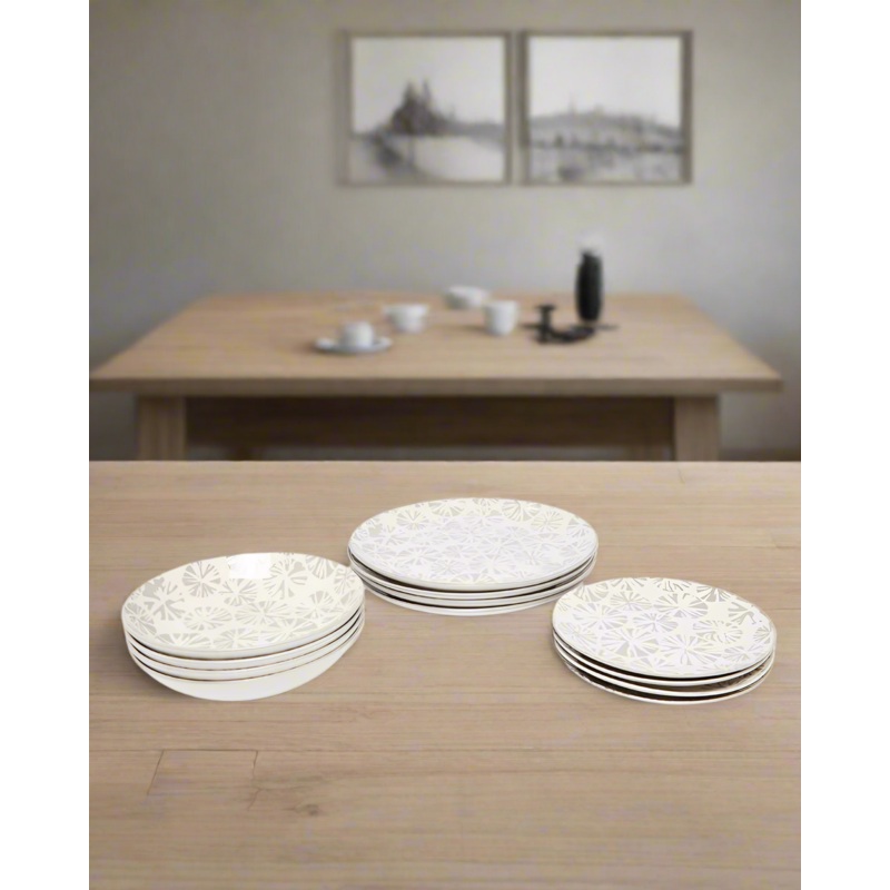 Add luxury to your table and serve food in the most appetizing way with this white porcelain dinner set. This set consists of 4 plates, 4 side plates and 4 soup plates.Section: Home-DiningColour: GreyPattern: GeometricSet Includes: 4x Dinner Plate 4x Side