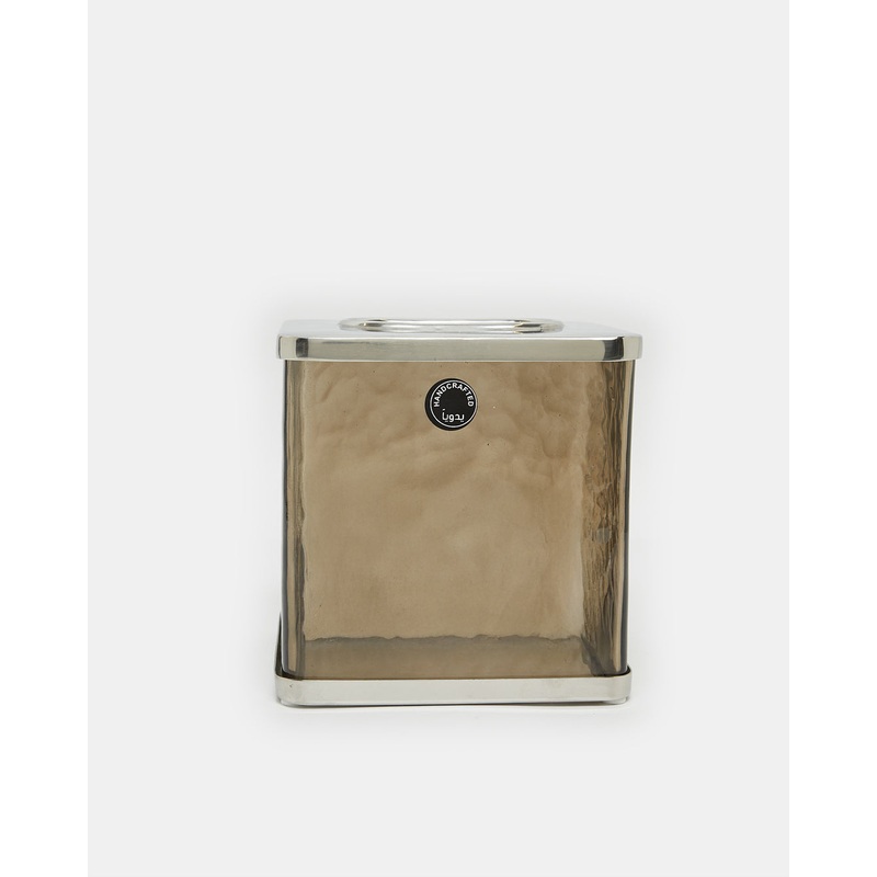 An elegant square tissue box made of hammered glass, combining functionality with luxury in your bathroom setup.Section: Home-BathroomColour: GreyPattern: TexturedSize/Dimensions: Height 14cm x Width 14cm X Length 14cmMaterial: Glass, SteelStyle No: 132486