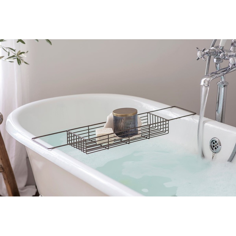 The Indore wire bath bridge provides a stylish and practical way to hold bathroom bottles and soaps. The iron wire has been expertly shaped into neat industrial looking lines and has an aged brass finish. The practical extended wire handles rest neatly on either side of a bath. Start a new ritual of unwinding after a long day and create a stylish bathroom space.