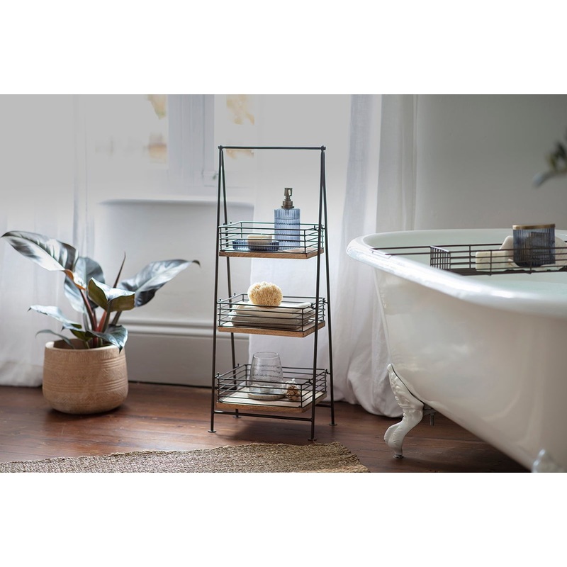 The Indore mango wood storage caddy blends the warm tones of natural, sustainable mango wood with the industrial finishes and design of linear iron. The iron has an aged brass tone which complements the warmth of the wood. The Indore bathroom storage caddy has three practical shelves each with a mango wood base and iron sides, to keep storage items in thier place.