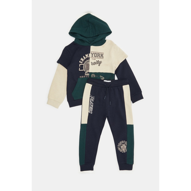 For active young boys, perfect for casual wear and play. This set typically includes a hooded sweatshirt and matching joggers, combining functionality with a trendy look.Gender: Infant Boys (3 to 24 Mths)Colour: Black/BeigePattern: PrintedNeck: HoodedSleev