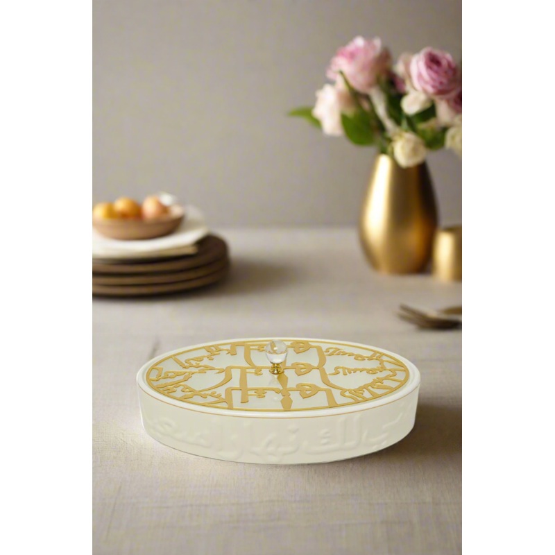 Have a cup of Arabic coffee with dates and experience the Arabic culture, you can use this stylish bowl for different dates and sweets. It is made of new bone china and topped with a clear lid.Section: Home-DiningColour: IvoryPattern: EmbellishedSize: Diam
