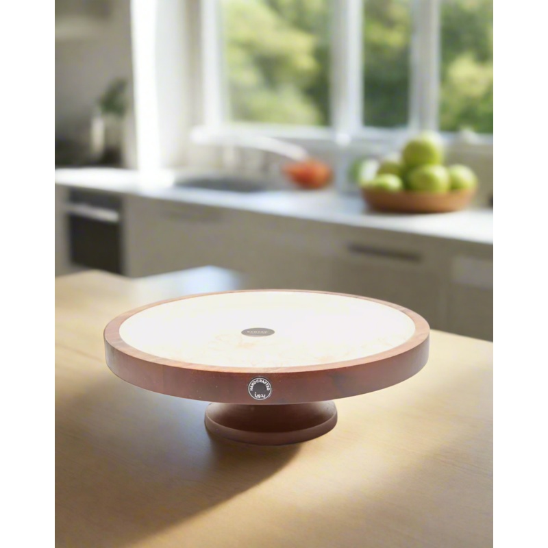 A beautifully crafted wooden cake stand with a round design, perfect for displaying cakes and desserts with elegance.Section: Home-DiningColour: IvoryPattern: Geometric PrintSize/Dimensions: Height 10cm x Diameter 30cmMaterial: WoodStyle No: 131309673