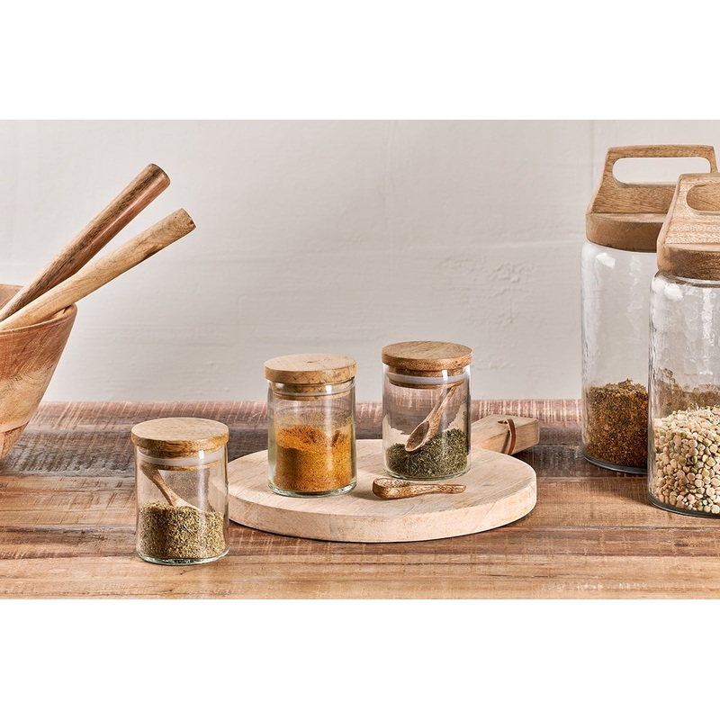 These enchanting Izaan spice jars are the perfect storage pot. Each pot has a sustainable mango wood lid and air tight seal. The glass jar is crafted from recycled glass, finished with a hammered texture. Each jar comes with a hand carved mango wood spoon.