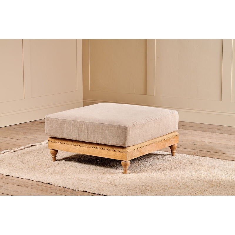 Our Krissa linen footstool is expertly constructed from solid mango wood and upholstered in a calming natural linen. This timeless footstool is the perfect companion to our Krissa modular sofa and can be styled as a coffee table or added to the sofa to create a chaise longue effect. This timeless footstool is crafted from natural mango wood, jute, and neutral linen. It features elegant turned feet and will bring a touch of pared-back sophistication to any living space.