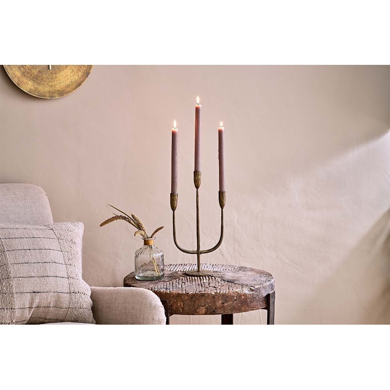 These elegant candelabras are crafted from iron using traditional methods. They have a rustic matt gold finish that is achieved during the soldering process. They make a striking addition to an evening dining table or displayed on a sideboard in a living space or hallway.