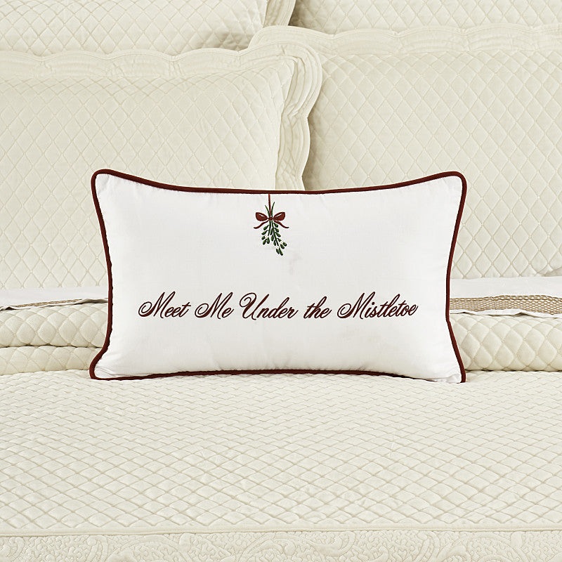 Celebrate the Holidays in elevated gleeful style with the Mistletoe Pillow. Featuring a mistletoe motif wrapped with red embroidered ribbon and several small pearl accents for a touch of glam. Meet me under the Mistletoe is scripted in beautiful red embroidery on the Cotton Sateen fabric. Pair this pillow with your favorite sofa or with the Holiday bedding, bath, and window collections from .