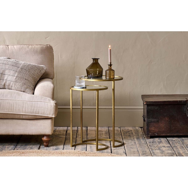 The set of two Nakuru side tables combine elegance and versatility in equal measure. These round side tables are crafted from iron and finished in this eye-catching warm brass hue, with a circular glass tabletop mirrored with a semi circular base. The tables nest neatly together taking up minimal space, but also providing flexibility.