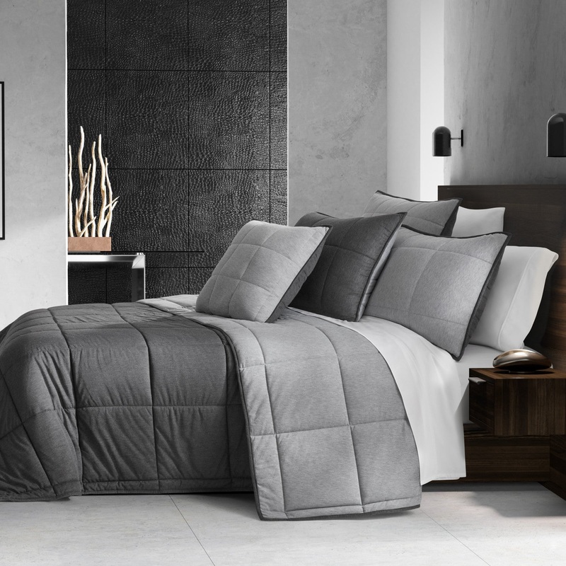 The Paxton Quilt Set offers a simple sophisticated touch of style and versatility to reshape your space into a calming contemporary retreat. The mediumweight quilt is great on its own or layered and is constructed with a box quilted design in plush microfiber. The fabric has a very soft hand, similar to your favorite t-shirt, which gets softer over time. Designed with a versatile solid color scheme that is fully reversible. It is available in 2 color options: navy blue with light blue or classic grey with dark grey. The included shams are quilted with matching stitching to complete this modern stylish ensemble.