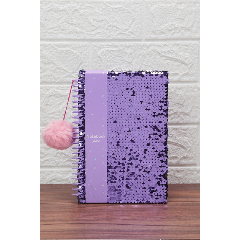 Get this shimmering purple notebook with a reversible sequin cover. The cover features a fluffy pom-pom detail and a spiral binding. Perfect for adding a touch of glamour to your stationery collection.Gender: Travel AccessoriesColour: PurplePattern: Sequin