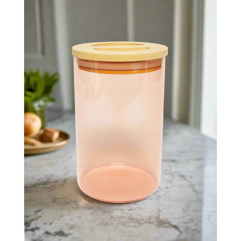 A durable and stylish storage jar, perfect for keeping food fresh and organized. Ideal for kitchen or pantry use.Section: Home-DiningColour: RedPattern: PlainSize/Dimensions: Capacity 950mlMaterial: Glass, WoodStyle No: 131425228