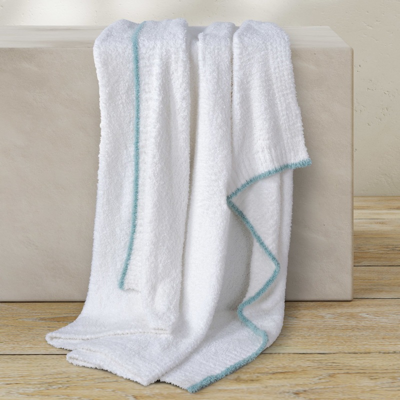 The Sahara Throw Blanket is the definition of cozy comfort. The soft and luscious hand, make this throw irresistible. The solid white color has a contrasting colored border and is available in an assortment of dcor friendly options. White with soft blue, a
