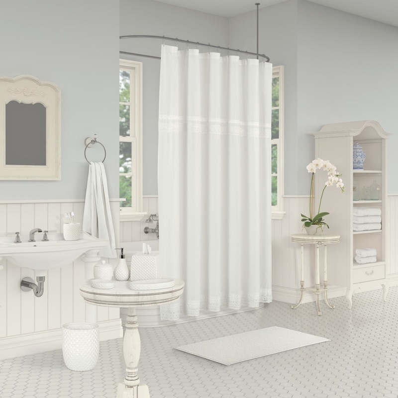 Add a timeless anchoring element to your cottage-inspired bathroom with the Samantha shower curtain. Featuring elegant white voile fabric with one-of-a-kind crochet trim detailing across the top and used to finish the hem. Easily complete the look and styl