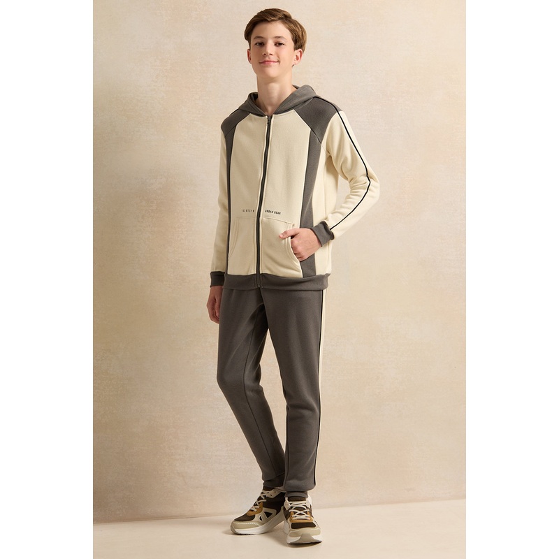 Made from super soft fabric for all-day comfort, this jogger set is perfect for active days. This set includes a hooded sweatshirt and long-length pants.Gender: Senior Boys (8 to 14 Yrs)Colour: BeigePattern: Cut And SewNeck: HoodedSleeves: Long SleevesSet