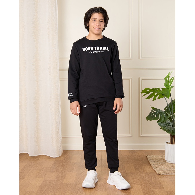 This set is perfect for boys who want to express their style while enjoying the ease of a complete outfit. Features a long-sleeved printed t-shirt and jogger pants.Gender: Senior Boys (8 to 16 Yrs)Colour: BlackPattern: PrintedNeck: Round NeckSleeve: Long S