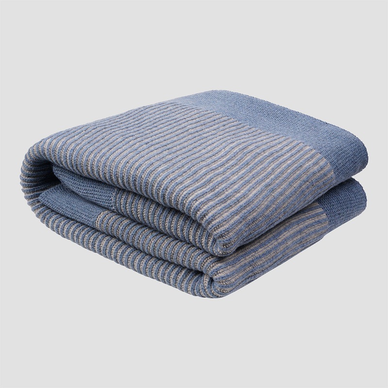 Reminiscent of handcrafted knitwear, our Stone Blue striped knitted throw features alternating weaves in warm blue and off-white tones. Woven from a wool blend, these throws are super soft and versatile. Add to the end of your bed for a cosy finishing touch, or drape over an armchair for an effortless look.