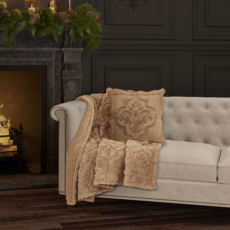 The Teigen Throw Blanket features a tufted plush fabrication that is delightfully soft and cozy. The unique medallion design is tufted and quilted and has a velvet reverse making it truly irresistible. Finished with a scalloped edge for yet another beautiful layer of detail. Layer this throw the Teigen collection and decorate in style with luxurious Holiday bedding, bath and window from . Available in evergreen, gold or winter white color options.