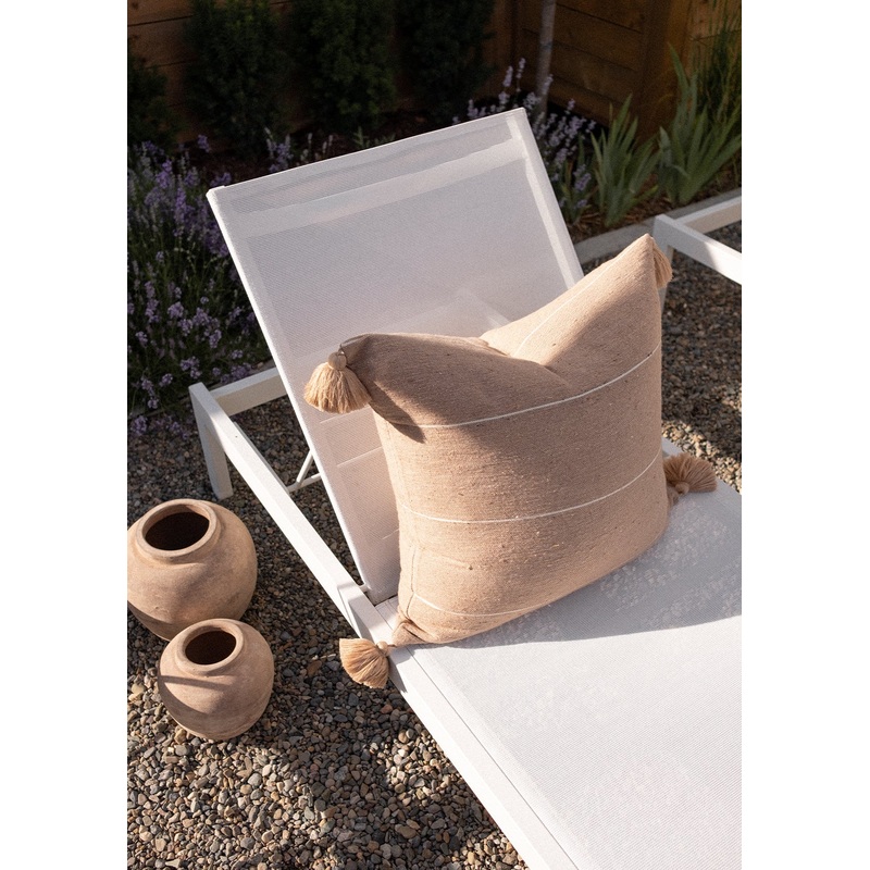 A pillow cover in the colour camel with silver stripes and large tassels on each corner. This calming pillow is made from super soft cotton.
