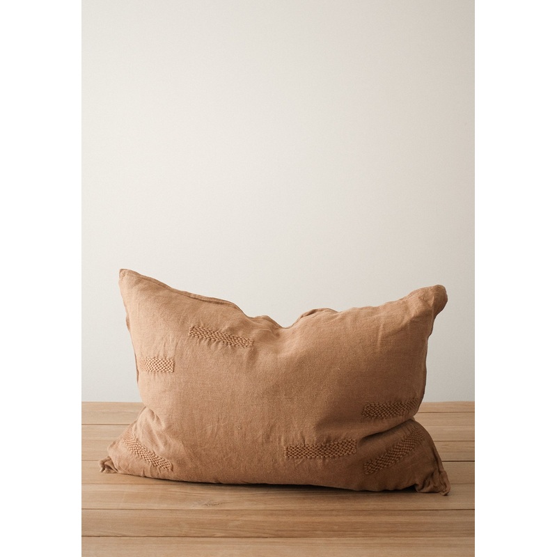 A warm light brown rectangular pillow made from beautiful and soft linen. This pillow has a subtle and calming raised pattern adding just a touch of texture.
