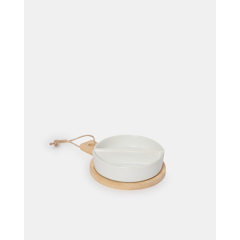 Modern ceramic round bowls are paired with a sleek bamboo tray. Ideal for serving dips, nuts, or sauces with a natural touch of charm and practicality.Section: Home-DiningColour: White/BrownPattern: PlainSet Includes: 2x Bowl 1x TrayMaterial: BambooStyle N