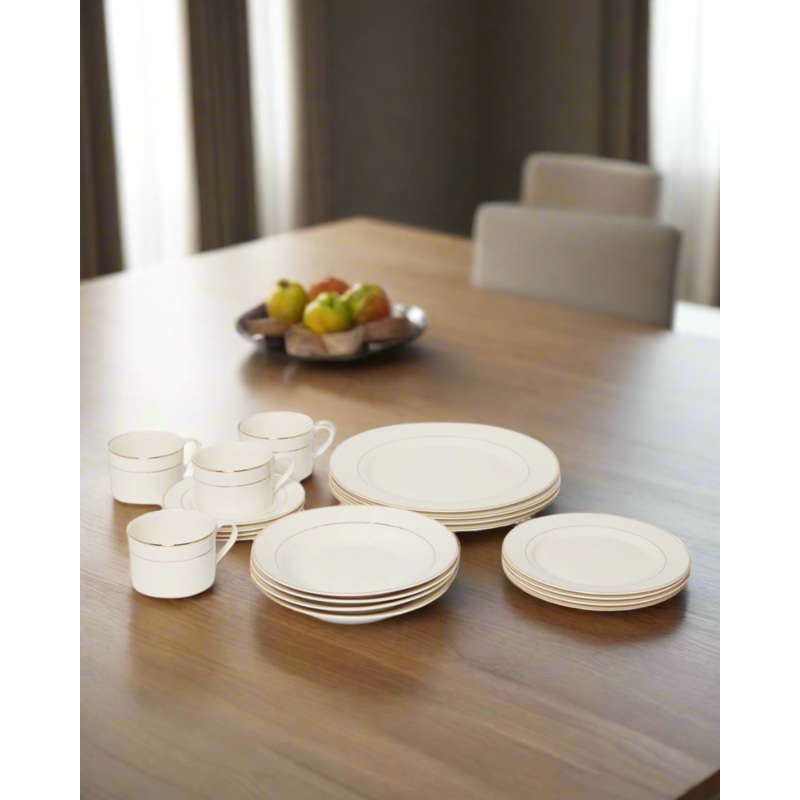 Transform your table with our premium dinner set, offering the perfect balance of functionality and elegance for every meal.Section: Home-DiningColour: White/GoldPattern: EmbellishedSet Includes: 4x Dinner Plate 4x Soup Plate 4x Cup 4x Saucer 4x Dessert Pl