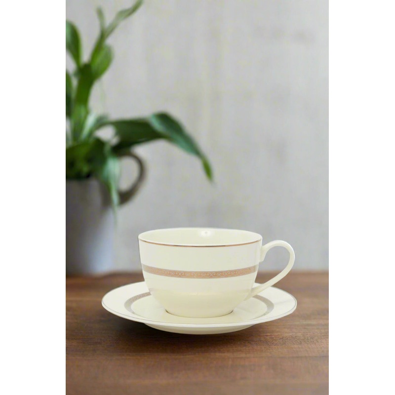 Add a touch of elegance to your tea time with this cup and saucer set featuring a delicate gold rim. The sophisticated design blends timeless charm with modern luxury, making it perfect for any occasion or a special gift.